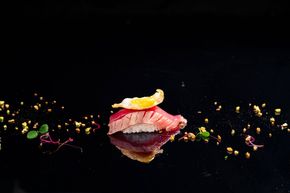 Nigiri di tonno scottato, con uova di quaglia, salsa tartufata e erba cipollina