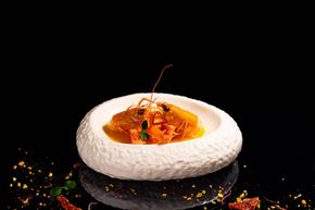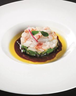 Tartare di gamberi dolci con alghe, olio extra vergine di oliva e soia