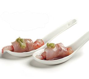 Involtini gambero dolce, avvolto con branzino, conditi con salsa asama