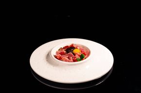 Tartare di tonno marinato, condita con crema di tartufo e uova di quaglia