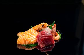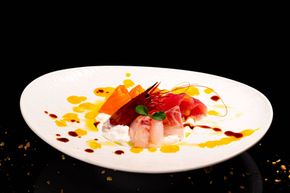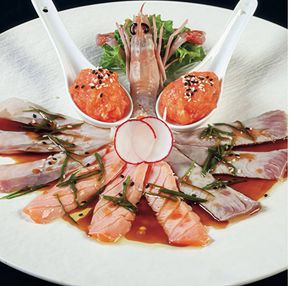 Fettine di salmone, tonno, branzino scottato e scampi, tartare di salmone, con salsa asama