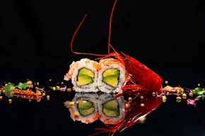 Roll di riso farcito con avocado e philadelphia, guarniti con gambero rosso mazara crudo