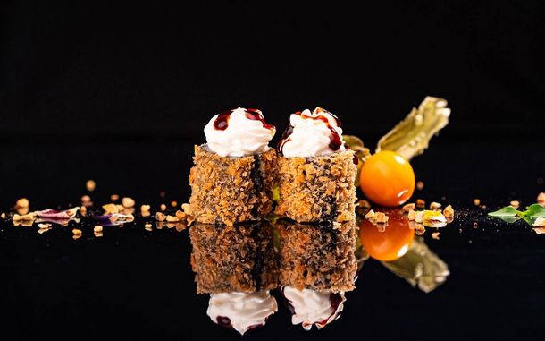 Tempura di gamberi avvolti con salmone, guarniti con philadelphia, kataifi e teriyaki